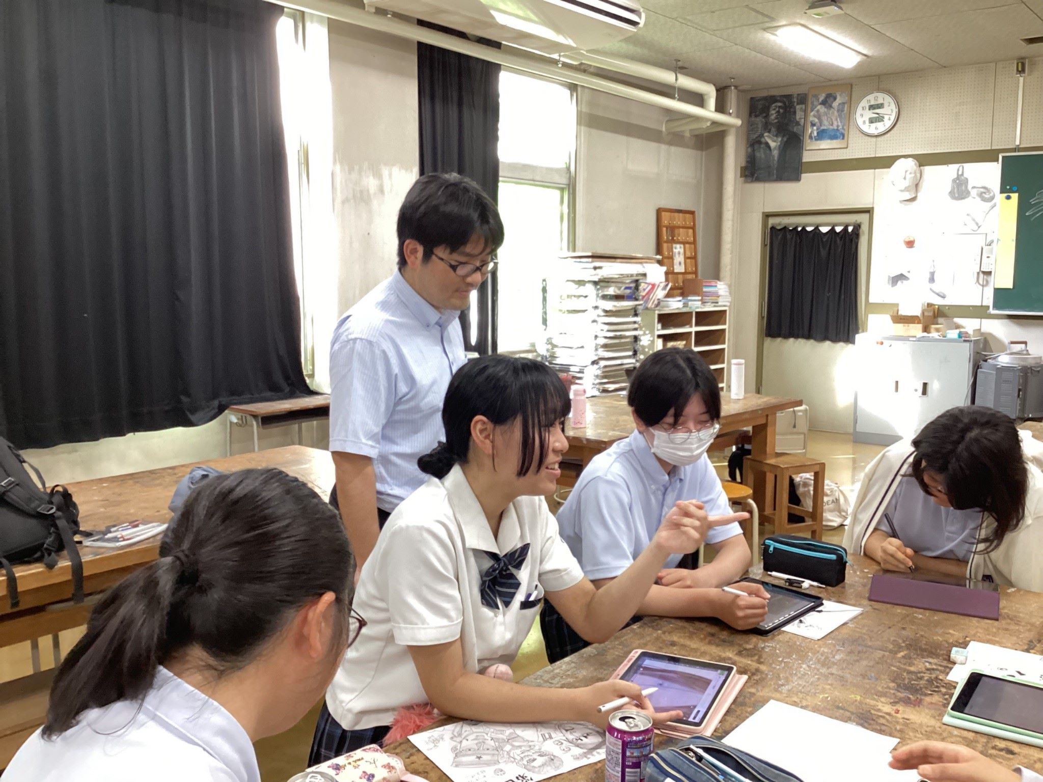 火曜日と金曜日の授業後に活動しています。主な活動として約2ヶ月に一度、部誌「天晴れ」の製本をしています。そのほかの活動では、部員で集まって絵を描いたり小説を執筆したり、希望者がコンクールに出展するキャンバスの作品を制作したりしています。コピックや色鉛筆などの部専用の画材や、ペンタブレット、iPad内のお絵描きアプリを活用して作品作りを楽しむことができます。また、生徒会や先生方から依頼を受けて美術部有志で作品を制作することもあります。(後述)